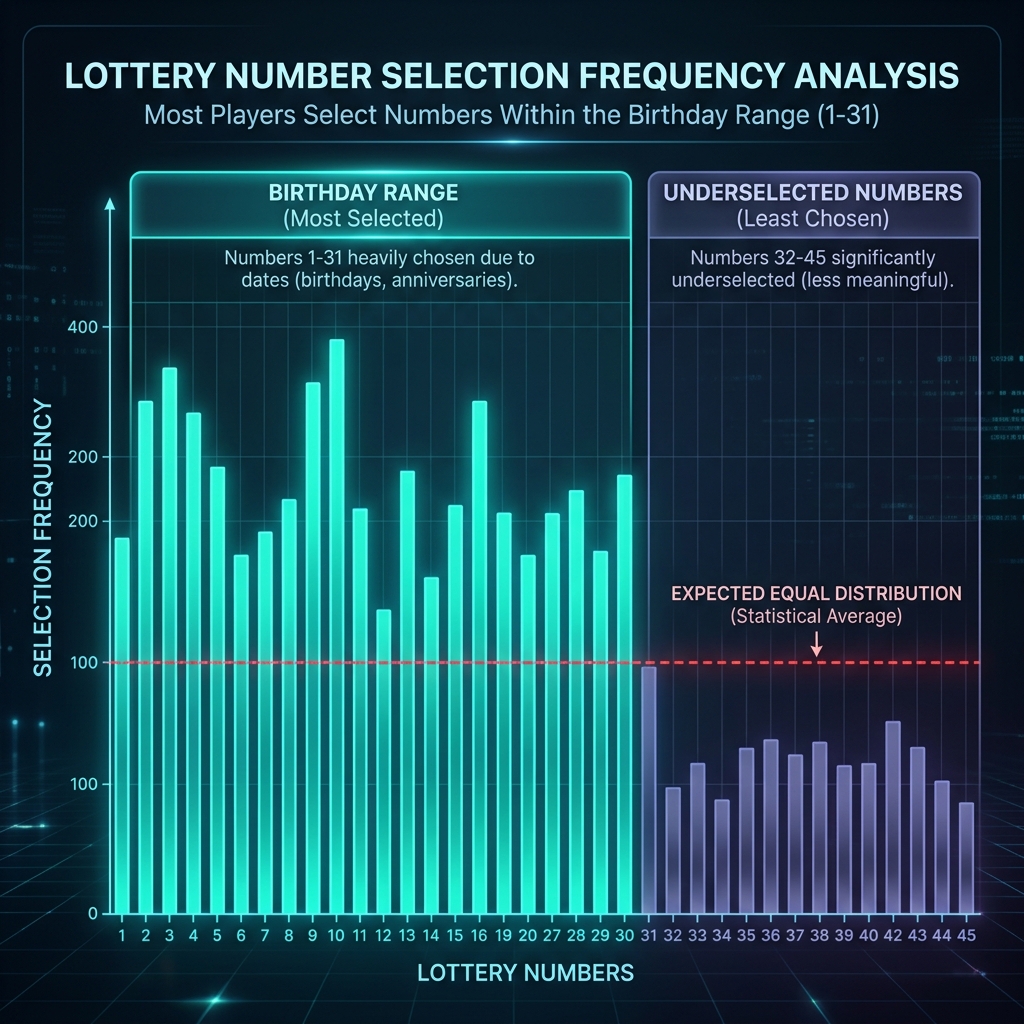 이는 역설적으로 1~31 번호만으로 구성된 조합이 당첨됐을 때 같은 번호를 선택한 사람이 많아 **당첨금이 더 많이 분배(당첨금 감소)**될 수 있음을 의미한다. 32~45 사이의 번호를 적절히 포함시키는 것이 기댓값 측면에서 실질적으로 유리할 수 있다.